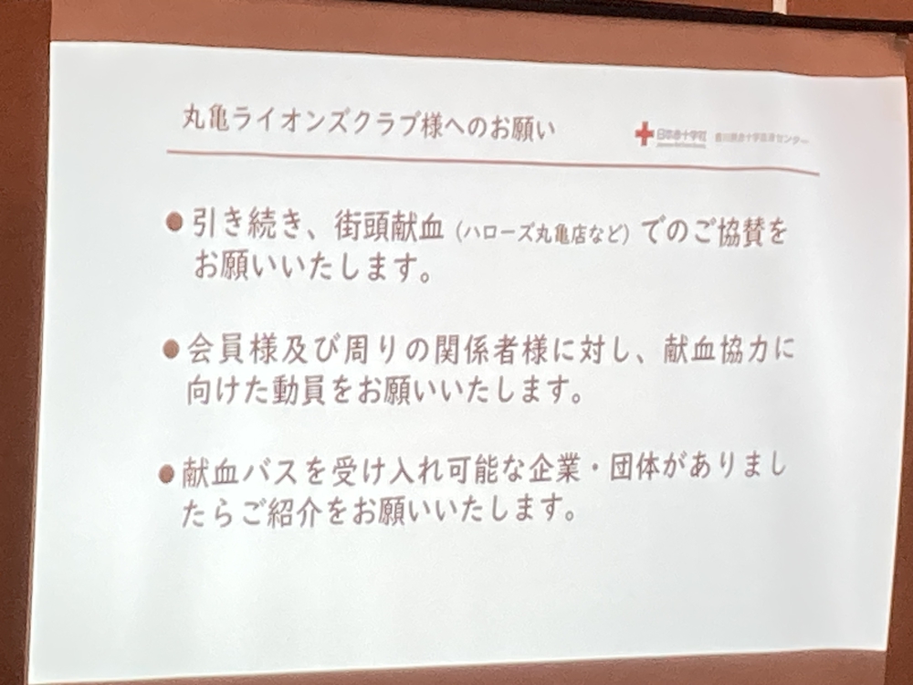 改めて、献血の大切さと課題を認識できました。特に4歳児の男児が輸血が必要な状況下、輸血を受けると元気になることを知っていて、血液を「アンパンマンのエキス」と呼んで日々命を繋いでいた動画が印象的でした。これからも丸亀LCは、継続して献血の必要性と重要性を伝え活動していく事が大切だと思いました。今後も引き続き、皆さまのご支援とご協力をよろしくお願い致します。